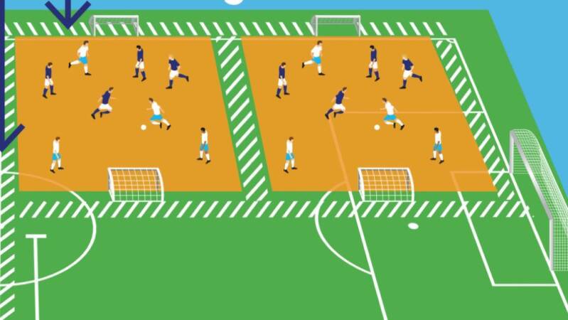 Je maakt 2 (1/8e)velden van te voren klaar. Beide velden zijn 30x20 meter. Je gebruikt dus 4 3x1 meter goaltjes.